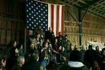Wir befinden uns in Trump Country. Es gibt hier nur eine Hautfarbe, die weiße, nur zwei Geschlechter, wobei die meisten Leute männlich sind; Armut ist der Status quo, und auch kulturelles Kapital ist keines vorhanden. Donnybrook handelt von perspektivlosen Kriegsveteranen, von Boxern, Drogenhändlern und heruntergekommenen Polizisten. Der Star-Spangled Banner hängt zu Beginn prominent in einer Armensiedlung und am Ende bei einem illegalen Boxturnier, dem namengebenden Donnybrook, das – es wird im Film so wertungslos gesagt, wie das möglich ist – von einem Nazi veranstaltet wird. Donnybrook zeigt keine USA, die wieder groß sind. Es wird nicht von einer Nation geträumt, die der Welt ein Beispiel sein soll. Und den Versprechen von Politikern oder Idealisten wird nicht geglaubt. Die Flagge ist nur mehr ein Symbol für Trotz, Macht- und Dazugehörigkeitsbehauptung.