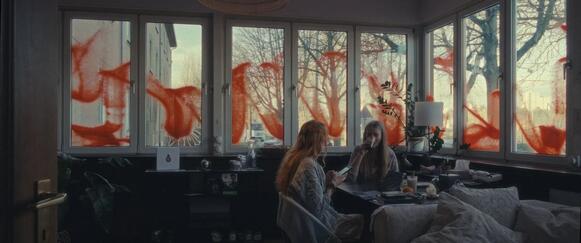 Als Soldaten des Lichts, der Kugeln abfangen würde, bezeichnet David, das Handy gezückt, Timo und präsentiert seinen Followern dessen angeblichen Sixpack, wobei eine kurze Pause die Leerstelle markiert, an der das Vorher-Bild von Timos Wandlung später im fertigen Clip eingefügt werden soll. Dieses Bild bleibt ungesehen, wie auch Davids Social-Media-Videos. Bloß einmal filmt die Kamera in Soldaten des Lichts eins davon auf Timos Handydisplay ab: Davids Interview mit dem Schweizer Geistheiler. Später kehrt der Film zum Moment der Aufnahme dieses Interviews zurück, als einer Art von Hinterbühne, wenn die beiden nach dem Dreh vom Balkon auf Sandanas teures Auto im Off blicken. Nach einem anderen Dreh für ein Video mit einem Krypto-Influencer spricht jener auf einem Parkplatz die Abmoderation: das Auto wird offen zur Schau gestellt und soll Stärke demonstrieren. David greift währenddessen seinerseits zum Handy und beginnt, ein Behind-the-Scenes-Video zu filmen, wobei er das Filmteam von Soldaten des Lichts erwähnt. Die beiden Stimmen überlagern sich in einer Totalen zu einem Wirrwarr. Das KRD mag Gewaltlosigkeit propagieren. Als Angriff erscheint aber dieses Sinnbild einer Sphäre zersplitterter Perspektiven.