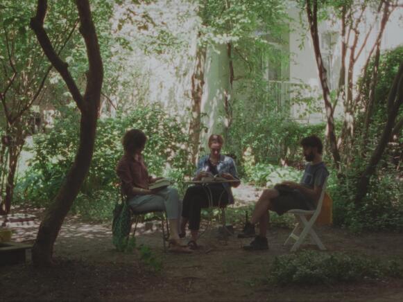 Berlin Kreuzberg, in dem wenige hundert Meter durchmessenden Raum zwischen Mehringdamm und Chamissoplatz, zwischen Bergmannstraße und U-Bahnhof Gneisenaustraße: Vier auf die 40 zugehende Wahlberliner sitzen in Altbauküchen und Hinterhöfen, im Viktoriapark oder im Café. Wie in allen drei bisherigen Spielfilmen des Regisseurs Ted Fendt besteht auch der Großteil von Auslandsreise aus quasi-fachlichen Gesprächen über Literatur – genauer gesagt über bestimmte Passagen aus dem Werk der italienischen Schriftstellerin Anna Maria Ortese. Es geht um das Mischverhältnis des Realistischen und des Fantastischen, um den Vergleich von italienischem Originaltext und deutscher Übersetzung, um den möglichen spanischen Einfluss auf die Biografie und das Werk der Autorin.