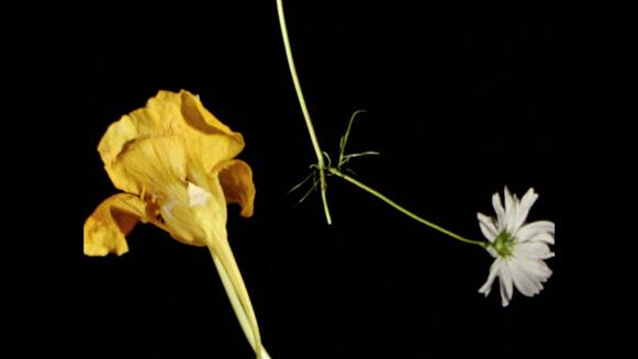 Jodie Macks neuester Film Lover, Lovers, Loving, Love (2025) ist gewohnt taktil – Handarbeit als Metapher für die Arbeit mit analogem Film ist und bleibt eine der tragenden Ideen im experimentellen Film – und strukturiert sich (wie der Titel bereits andeutet) über vier Phasen. In der ersten zeigt er eine Überlagerung zweier Blumen, die von oben und unten mittig in den Rahmen gehalten und dann im oder gegen den Uhrzeigersinn gedreht werden, so dass in der Mitte des Bildes ein Blütentanz entsteht. In der zweiten Phase arrangiert Mack verschiedene Vasen und Gestecke in Einzelbildern und trennt sie jeweils mit schwarzem Startband, was auf der Leinwand ein pulsierendes Flimmern erzeugt. Die dritte Phase überträgt das Flimmern auf Blumentapeten – und damit zurück zu dem Textilen, das die Basis von Macks früheren Filmen wie The Grand Bizarre (2018) und ihrer Blanket-Statement-Serie (2013) bildet – und schneidet diese gegen reale Blumen. In der letzten Phase flimmern Blumen gegen einen weißen Hintergrund. All dies bringt in einer ekstatischen Normalität die Farbvielfalt und Größenunterschiede der Materialien hervor, bevor sie dann am Ende im Wasser zu einem Blütenmeer verschwimmen.
