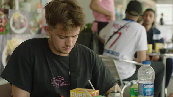 Sophia Groening setzt ebenfalls auf filmische Durchlässigkeit in ihrer sprachlich scharfen Miniatur Muss ja nicht sein, dass es heute ist. In Köln-Finkenberg (warum müssen Kölner eigentlich immer ihren Kiez als Verortung dazusagen?) sitzen vier Jugendliche zusammen beim Döner. Schon die Entscheidung zwischen Döner und Pizza ist schwer. Doch dann will der eine die Aufmerksamkeit einer Frau, die ihm gefällt. Statt sie anzusprechen, will er ihr eine Nachricht schreiben. Es geht ans Eingemachte, er lässt nicht locker: von der Bedeutung der Satzzeichen, der Groß- und Kleinschreibung, bis zur Frage, welche Bedeutung das Wort „heute“ hat. Geschrieben von Groening zusammen mit Jan Bonny und Jan Eichberg, durchzieht den Film eine wunderbar lässige Rastlosigkeit, eine Aufregung und Anspannung wie bei den Safdie-Brüdern (Uncut Gems, Good Time …). Stilistisch behauptet Groening eine Unmittelbarkeit und etwas Ungeformtes, wie es geformter nicht sein kann. Maßlos unscheinbar, könnte man auch sagen.